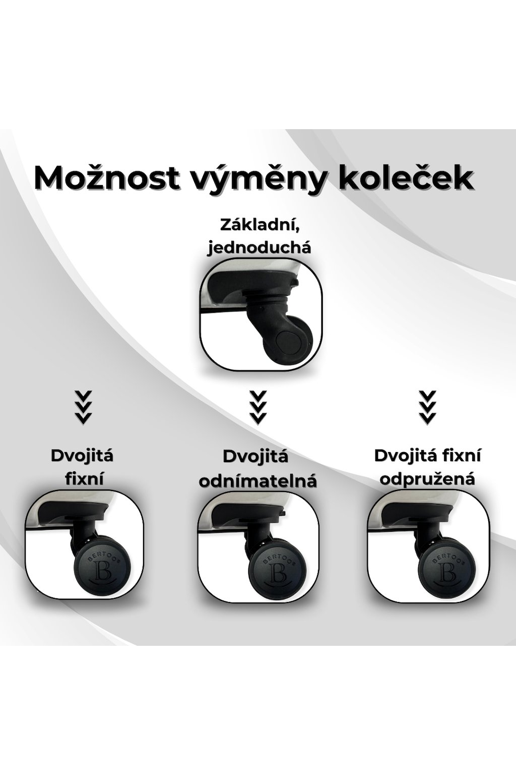 - 4 otočné odnímatelné kolečka, kufr je určen pro manipulaci na všech 4 kolečkách!