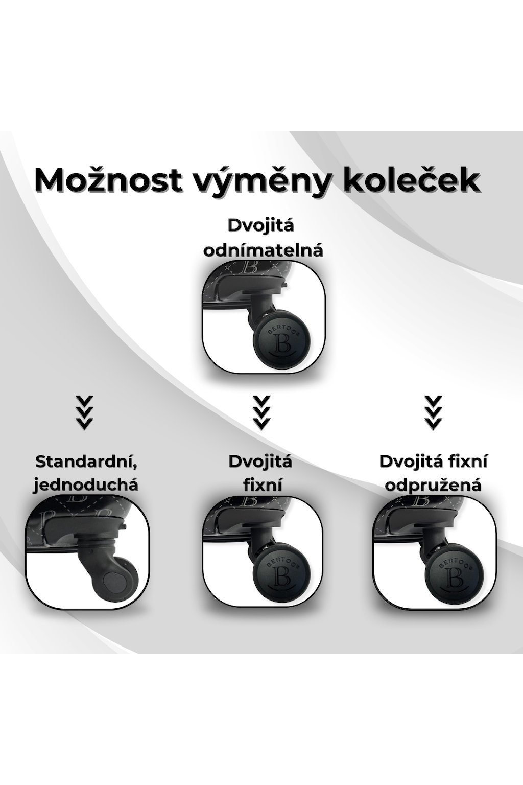 - 4 otočná dvojitá odnímatelná kolečka, kufr je určen pro manipulaci na všech 4 kolečkách!