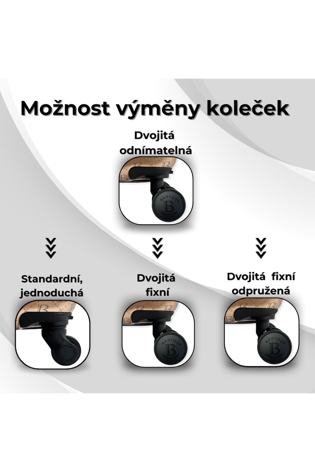 - 4 otočná dvojitá odnímatelná kolečka, kufr je určen pro manipulaci na všech 4 kolečkách!