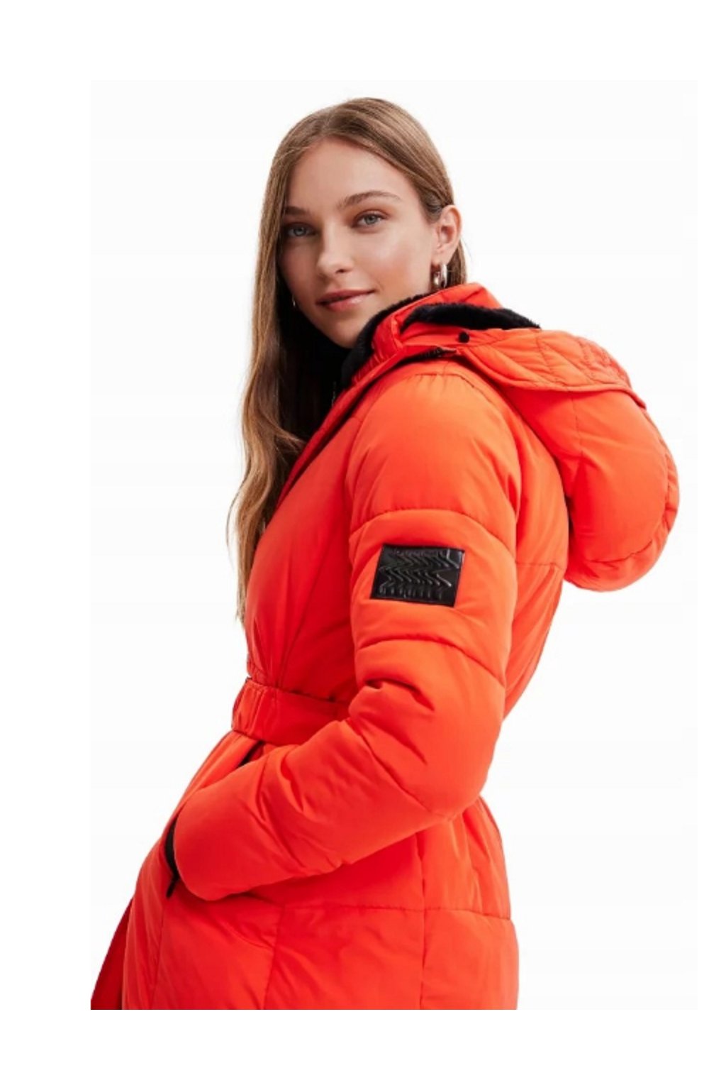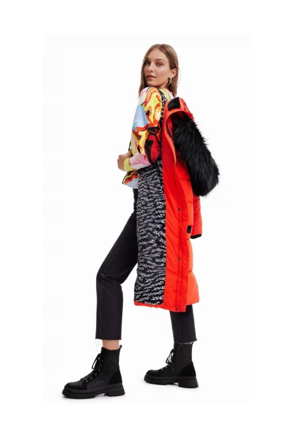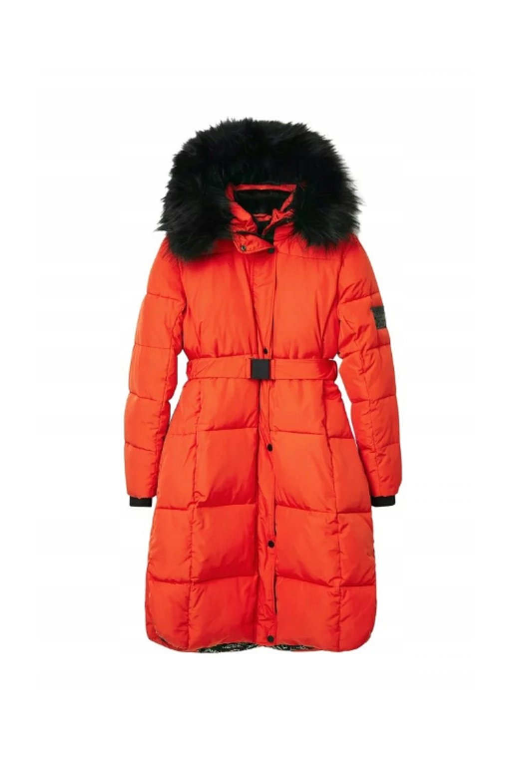 Dámská zimní bunda značky Desigual v červeno - oranžové barvě s černými doplňky. Bunda má vysoký límec, odnimatelnou kapuci s kožešinou, dvě kapsy a zapínání na cvoky a zip. Je vyrobena z hřejivého recyklovaného materiálu, který vás ochrání před chladným počasím.