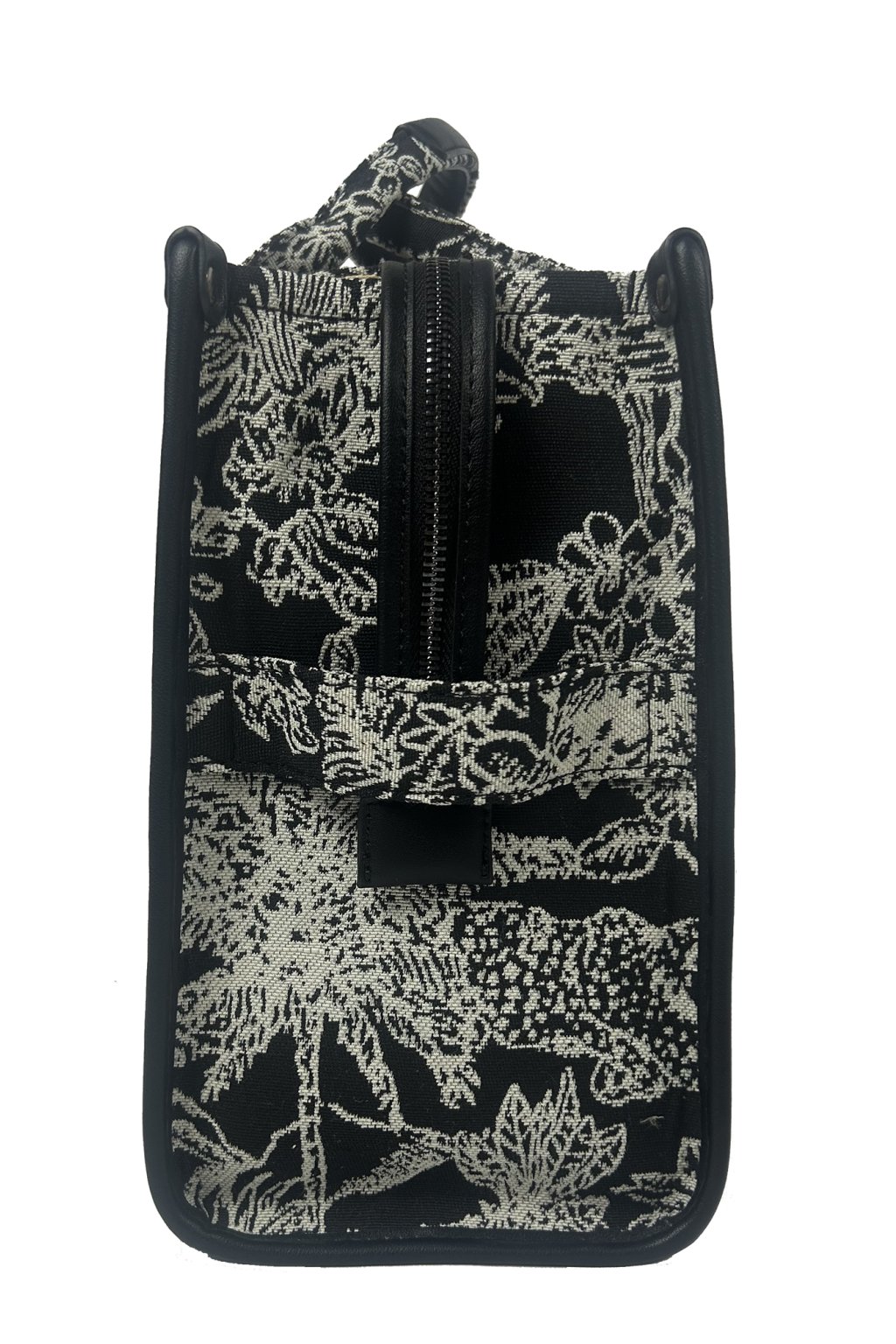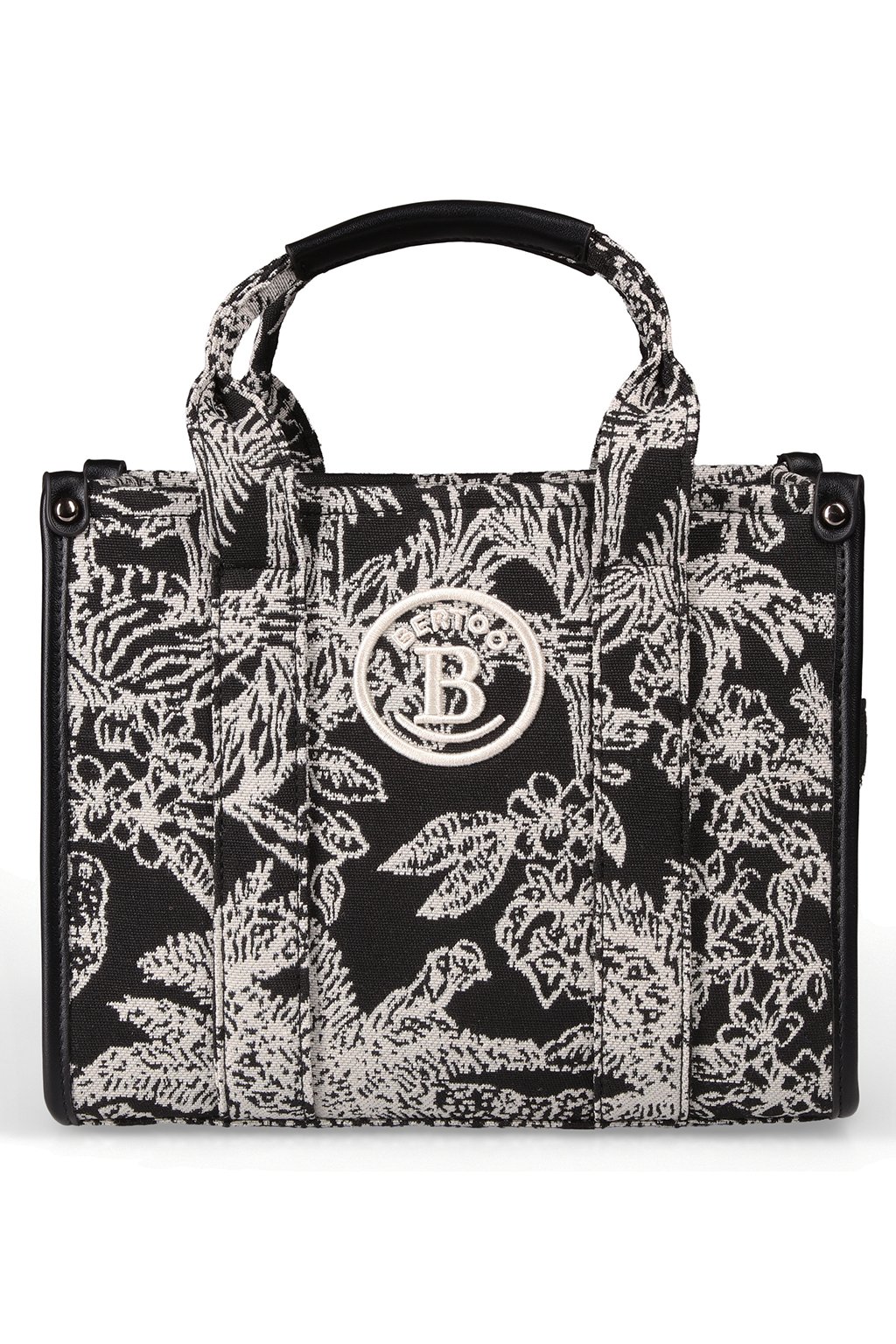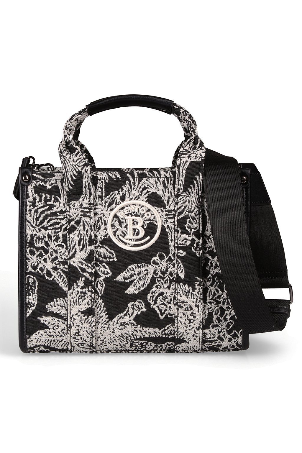 Černá umělá kůže byla s citem použita na lemy a části madel, což kabelce dodává elegantní kontrast i odolnost při nošení. Součástí je také dlouhý černý popruh, který je nastavitelný, a tak si kabelku snadno přizpůsobíte pro nošení na rameni i jako crossbody.