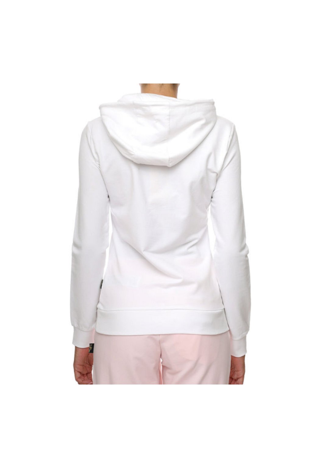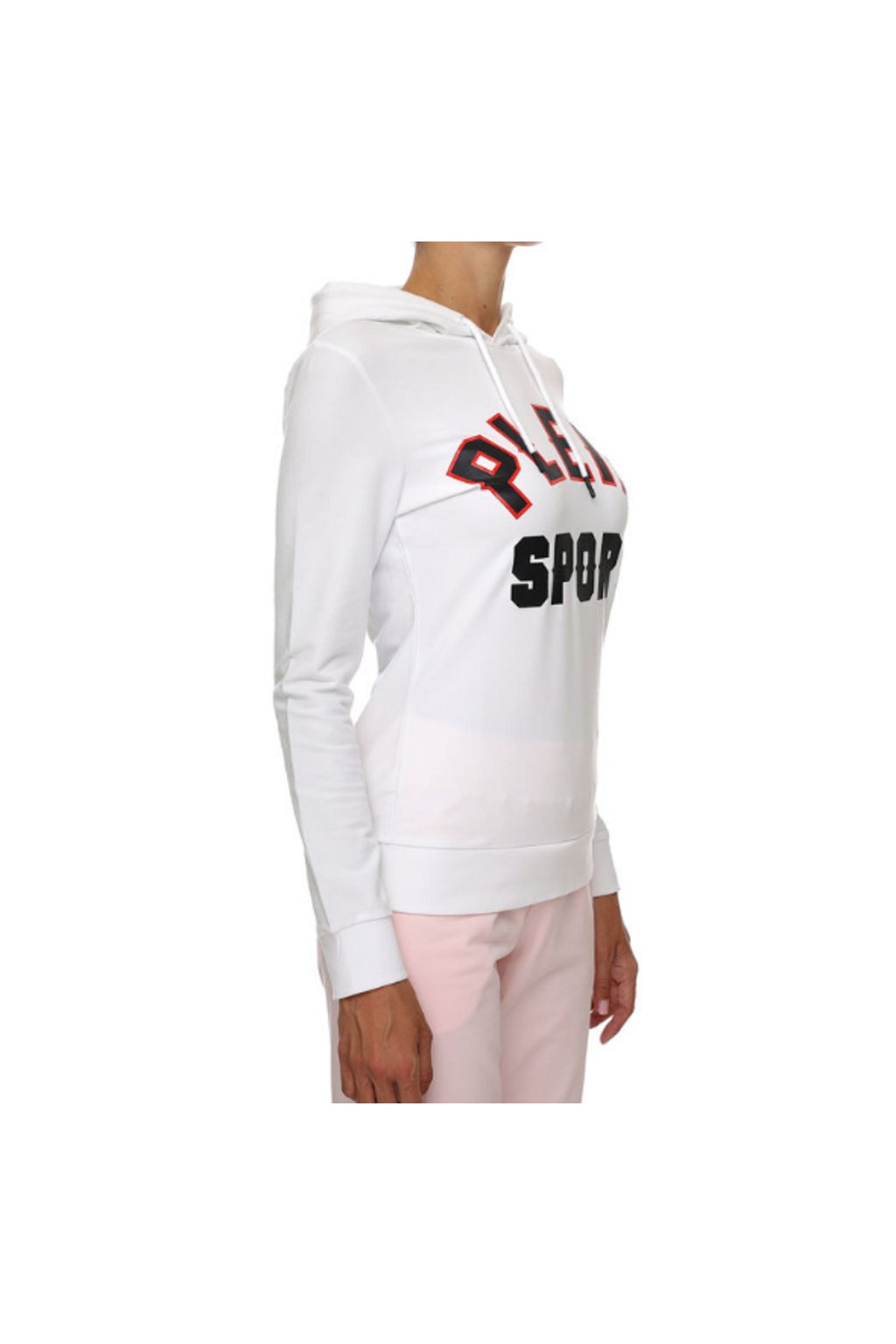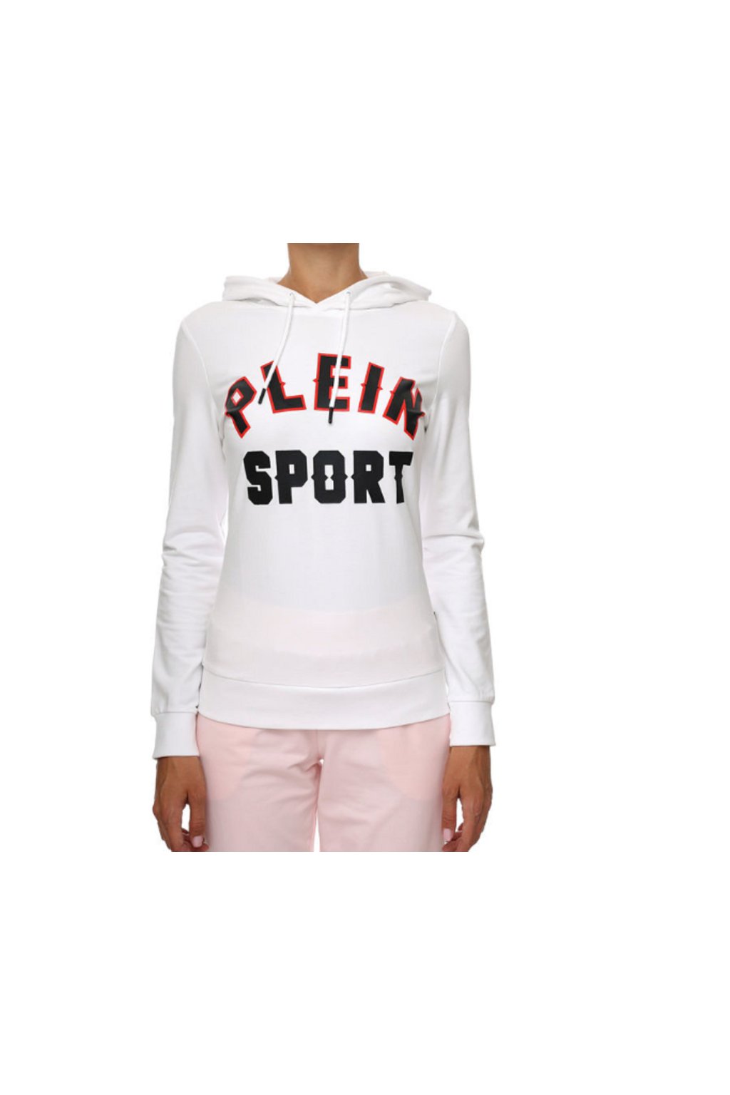 Dámská mikina značky Plein sport v bílé barvě. Mikina má kapuci na tkaničky, dlouhý rukáv a černočervený potisk s logem.