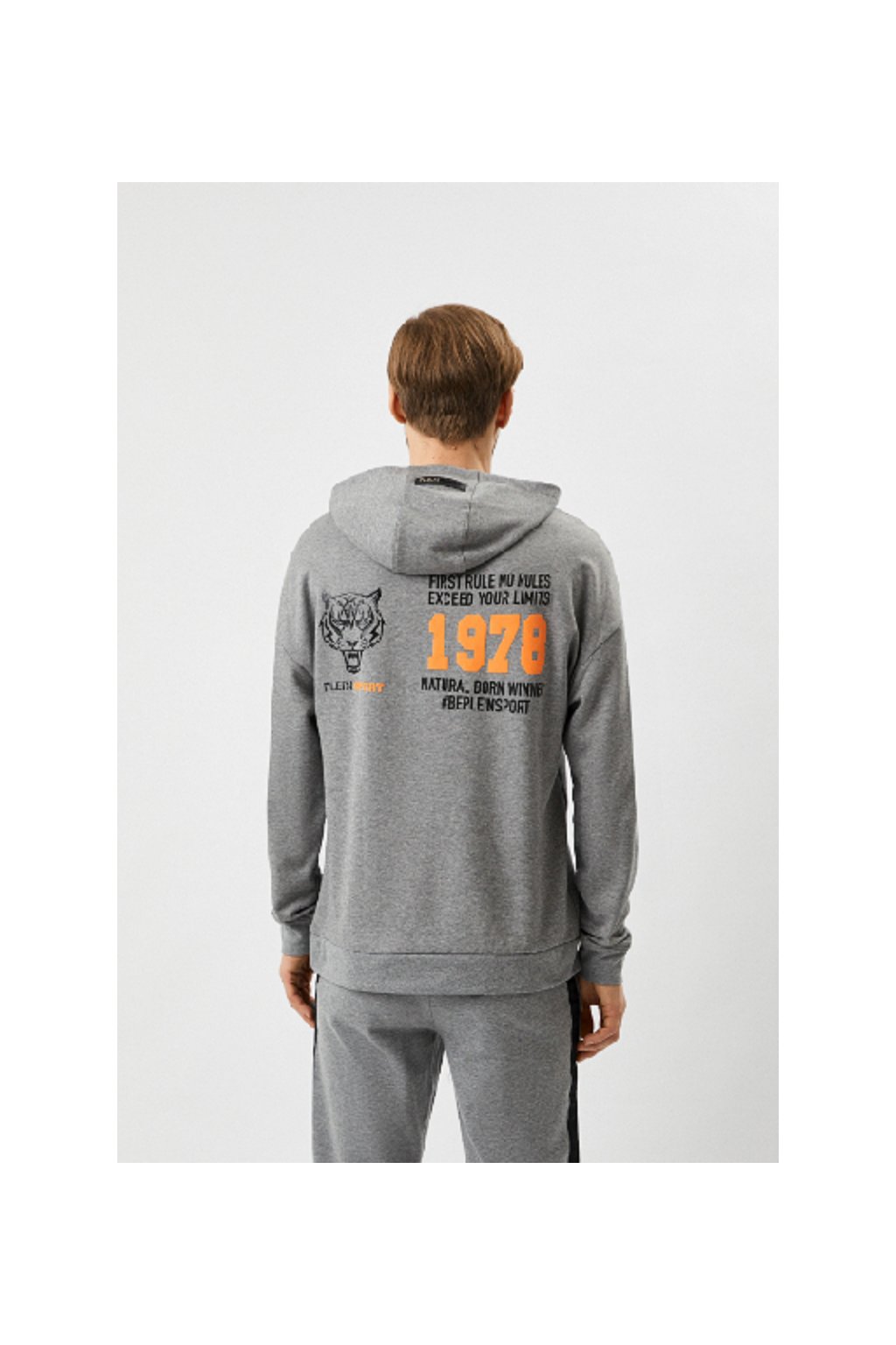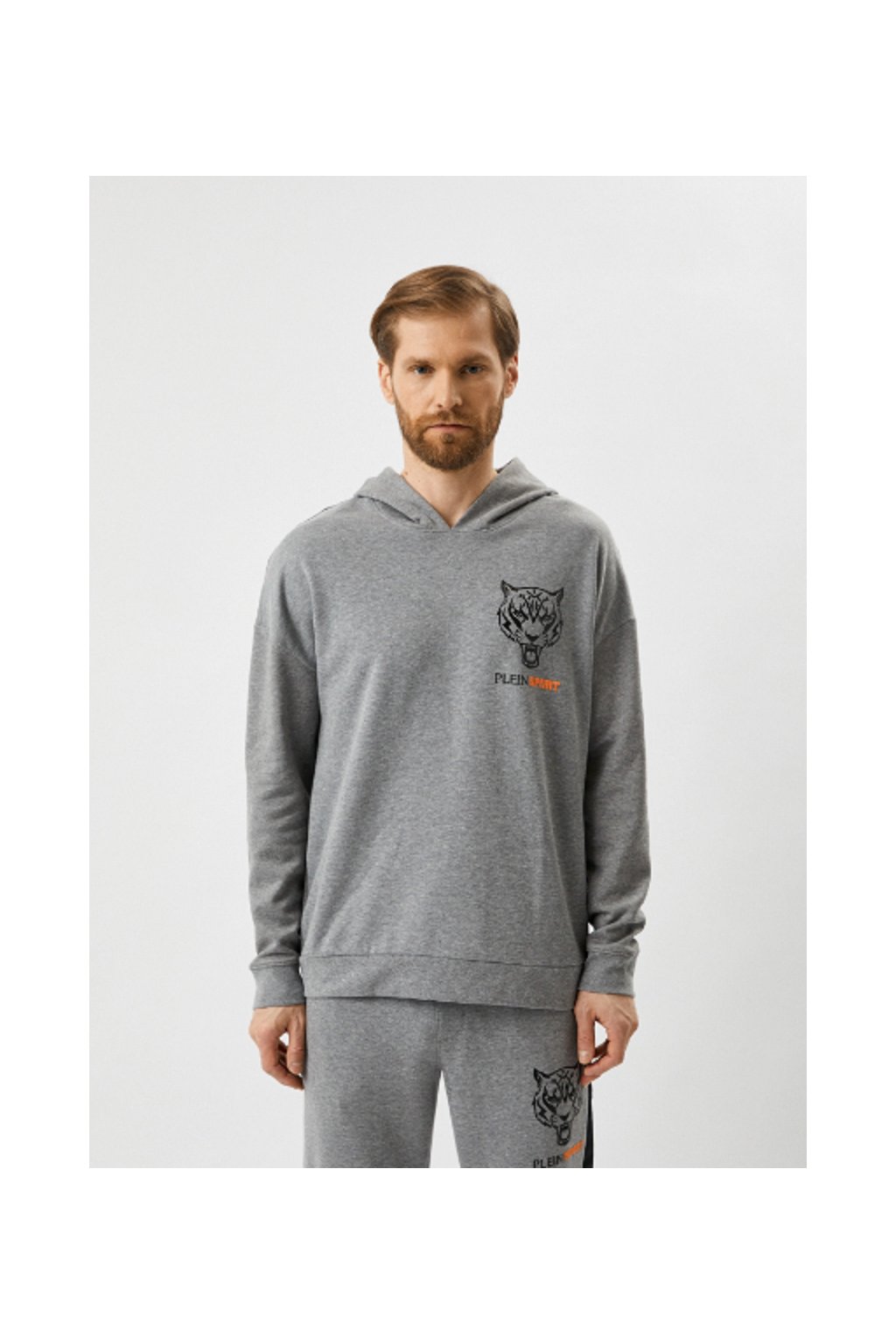 Pánská mikina značky Plein sport v šedé barvě. Mikina má kapuci bez tkaniček, dlouhý rukáv a na zádech je oranžový potisk.