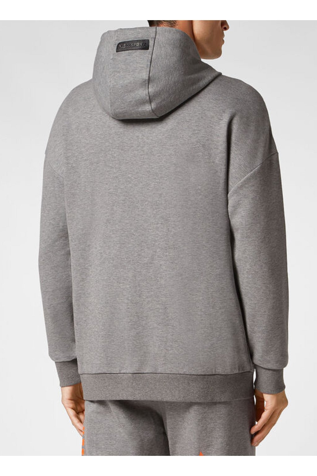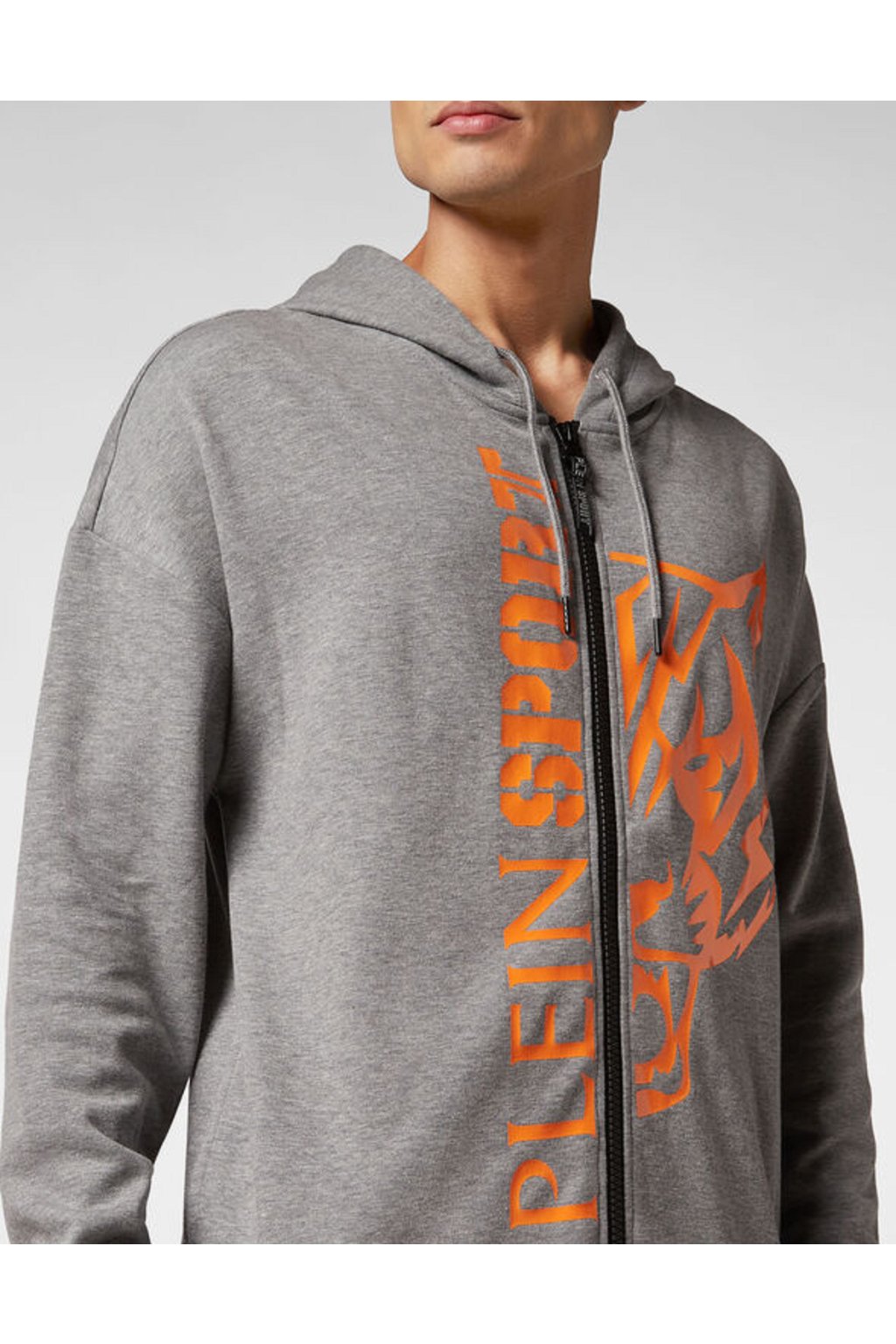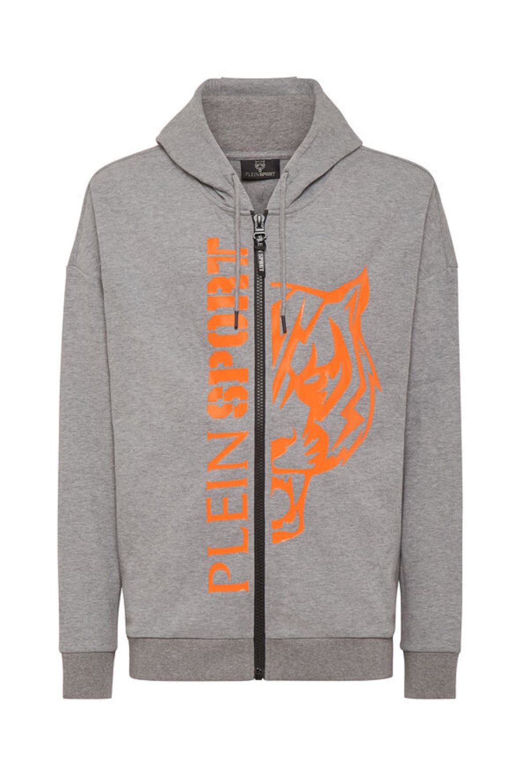 Pánská mikina značky PLEIN SPORT v šedé barvě s oranžovým potiskem. Mikina má kapuci, dvě kapsy a zapínání na zip.