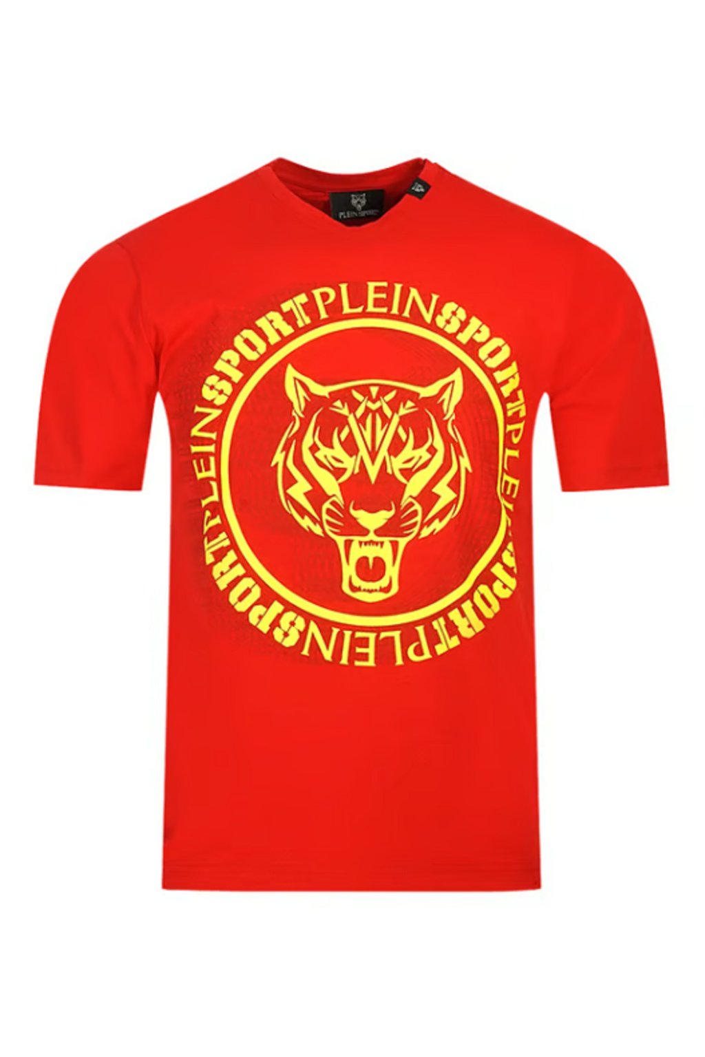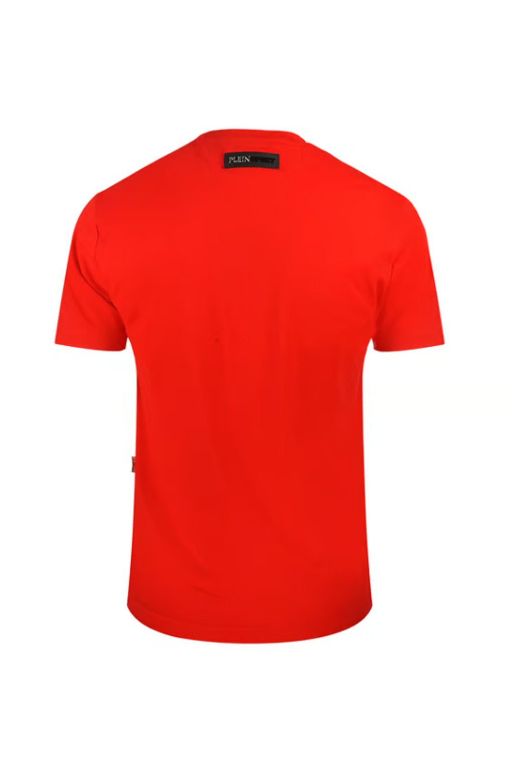 Pánské tričko značky Plein sport v červené barvě se žlutým logem. Tričko má krátký rukáv.